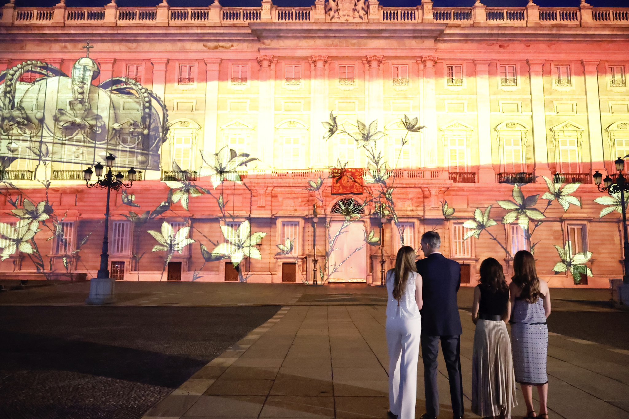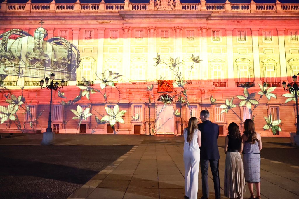 The royals hosted officials for a lunch at the Madrid Royal Palace, handed out Orders of Civil Merit decorations, visited the Gallery of Royal Collections, toured an exhibit on the anniversary, and attended an evening concert and light show.